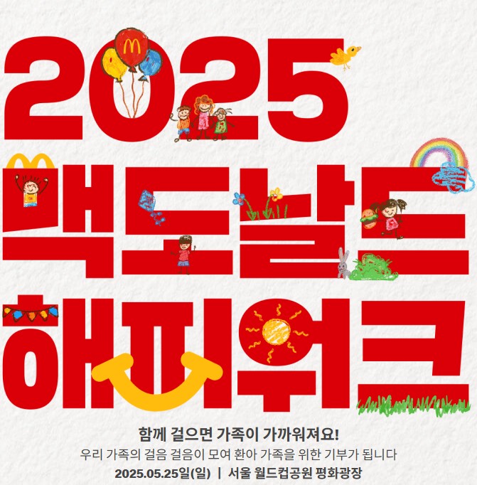맥도날드 해피워크(McDonald's Happy Walk)가 2025년 5월 25일 서울 월드컵공원 평화광장에서 개최됩니다. 이 행사는 가족 단위 참가자들에게 건강한 활동과 더불어 의미 있는 나눔의 경험을 제공하는 특별한 기회입니다. 맥도날드 해피워크는 단순한 걷기 행사를 넘어 사회공헌의 가치를 실천하는 프로그램으로, 참가비 전액이 어려운 환경의 아이들을 위해 기부됩니다.